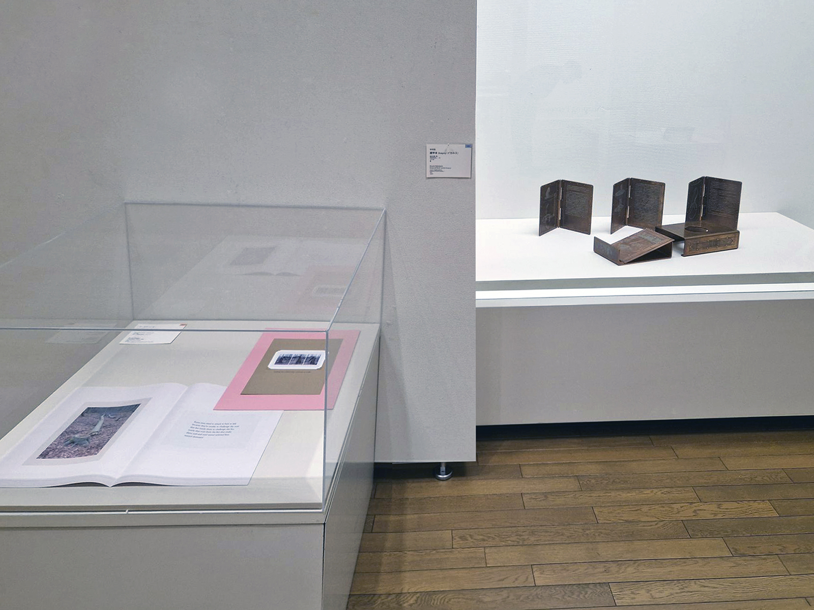 Eighteen Years Old in the artist’s book group show ‘At The Promised Place: Expanding Imagination Through Book Art’, Urawa Art Museum, Saitama, Japan, 15 November 2025-18 January 2026. Curated by Noriko Suzuki-Bosco and Sarah Bodman. Eighteen Years Old is printed on 55gsm newsprint and weighs just under 100gm. It is juxtaposed with Armored Book Icarus by Hiroshi Nakamura, a book made of copper weighing 23kg. Both works explore ideas around masculinity. Photo by Noriko Suzuki-Bosco